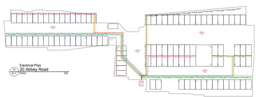 A 3D scan of the parking facility at Abbey Road. These scans are used to discuss and amend the scope of works alongside the client - this ultimately reduces disruption during the installation.
